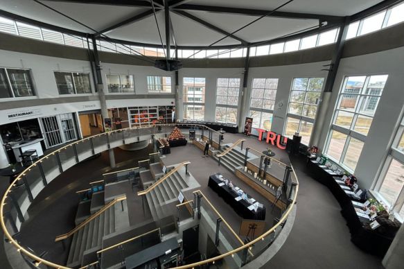 Situated at the heart of the Campus Activity Centre, this distinctive circular venue blends modern design with warm wood and brick accents—creating a striking backdrop for any event. Expansive windows fill the space with natural light and offer sweeping views of the TRU Campus Commons, bringing the outdoors in. As the building’s central corridor, this space naturally supports the smooth flow of attendees while seamlessly connecting our venues for tradeshows, cocktail receptions, and networking breaks.