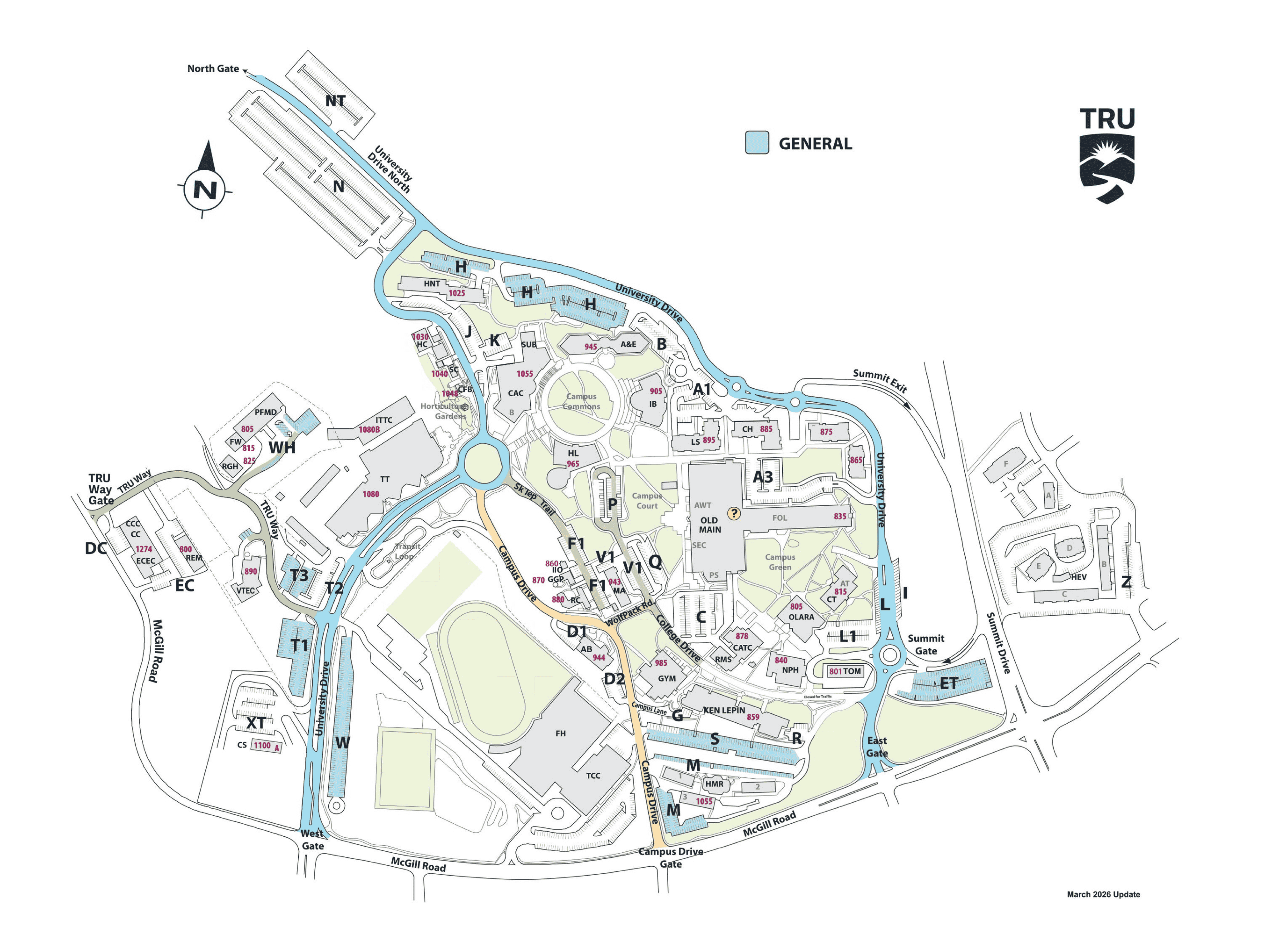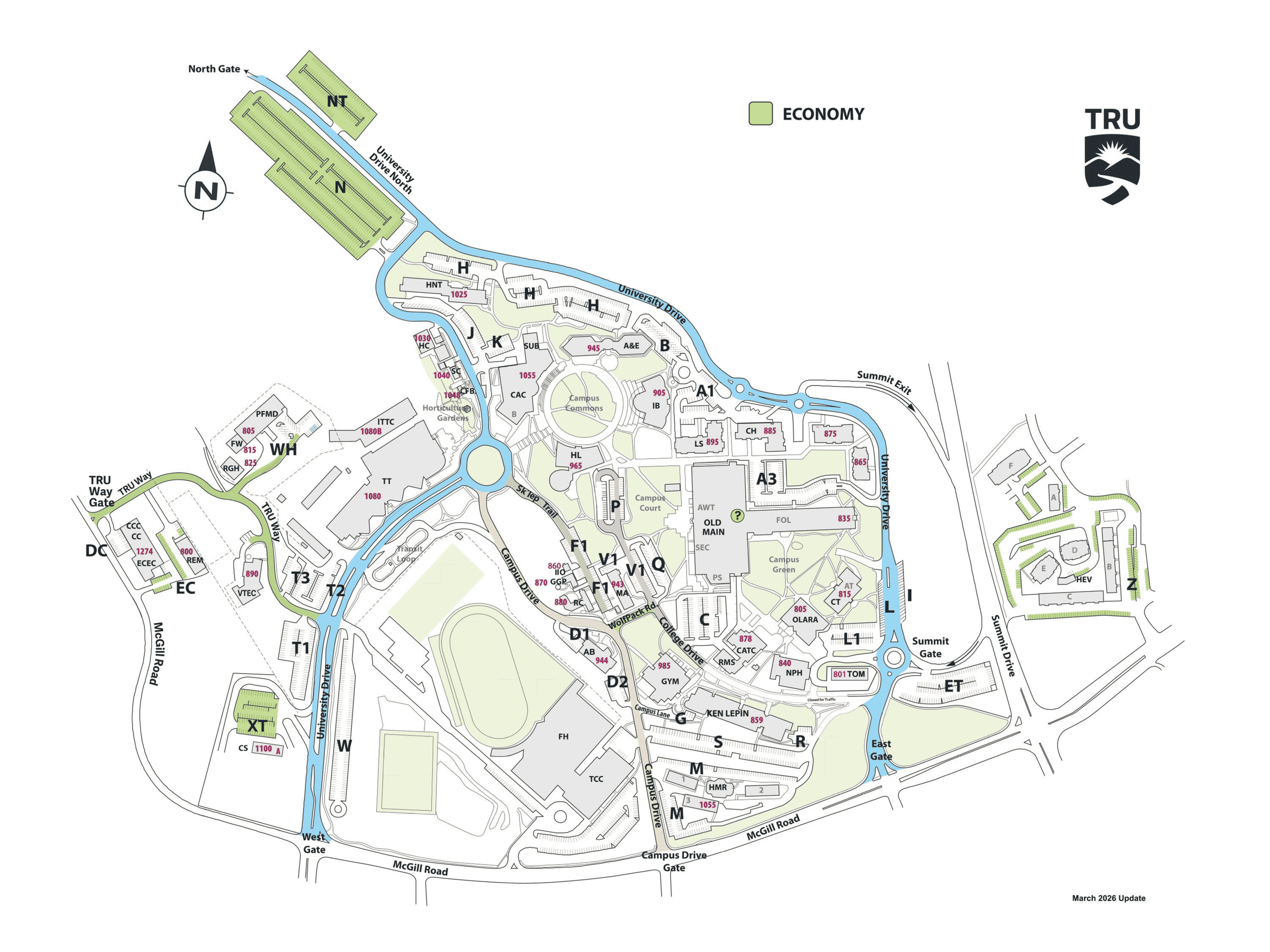 Visitors to TRU may park by the half hour in visitor parking spaces (up to a maximum of two hours), or for the day in general or economy parking lots. Pay parking is in effect from 8 a.m. to 5 p.m., Monday to Friday, except for statutory holidays or days that TRU is officially closed.